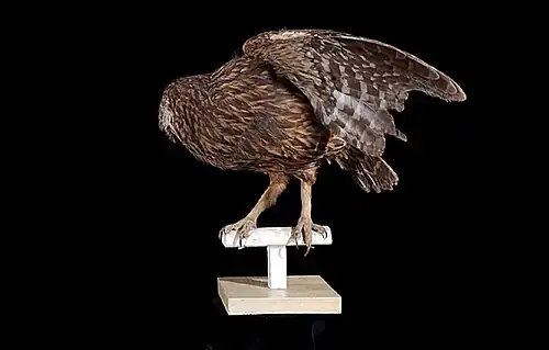 By 1880, the species was becoming rare. Only a few specimens were collected due to its location. Soon, the last recorded specimen was found dead at Bluecliffs Station in Canterbury, New Zealand on July 5, 1914.[15] Unconfirmed reports have been made since then; the last (unconfirmed) North Island records were in 1925 and 1926, at the Wairaumoana branch of Lake Waikaremoana.[16][17] There are reports of a laughing owl in the Pakahi near Ōpōtiki in the 1940s.[18] An unidentified bird was heard flying overhead and giving "a most unusual weird cry which might almost be described as maniacal" at Saddle Hill, Fiordland, in February 1952,[19] and laughing owl egg fragments were apparently found in Canterbury in 1960.[20]