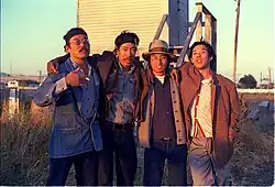 Lawson Inada (left) with Frank Chin, Shawn Wong, and Michael Chan on the set of John Korty's 1976 film, Farewell to Manzanar