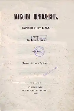 Of Kostić's plays. Maksim Crnojević (1863) represents the first attempt to dramatize an epic poem. Pera Segedinac (1875) deals with the struggle of the Serbs for their rights in the Austro-Hungarian Empire and his play Gordana (1890) did not receive much praise.[18]