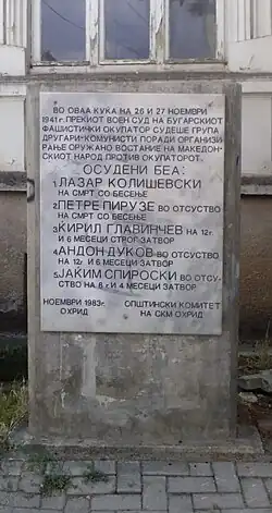 Memorial plaque from communist times, commemorating the sentencing of Koliševski and four others by the "Bulgarian Fascist Occupiers" in Ohrid