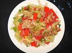 Lebanese cuisine is the culinary traditions and practices originating from Lebanon. It includes an abundance of whole grains, fruits, vegetables, fresh fish and seafood. Poultry is eaten more often than red meat, and when red meat is eaten, it is usually lamb and goat meat. Dishes include copious amounts of garlic and olive oil, and dishes are often seasoned with salt and lemon juice. Chickpeas and parsley are also staples of the Lebanese diet.[1][2][3][4]