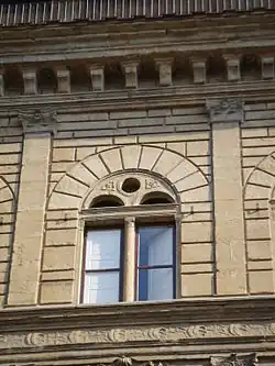 The design of the façade of the Palazzo Rucellai (1446–51) was one of several commissioned by the Rucellai family.[19] The design overlays a grid of shallow pilasters and cornices in classical style onto rusticated masonry, and is surmounted by a heavy cornice. The inner courtyard has Corinthian columns. The palace introduced set the use of classical building elements in civic buildings in Florence, and became very influential. The work was executed by Bernardo Rossellino.[10]
