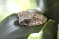 Adult males measure 44–50 mm (1.7–2.0 in) and females 60–70 mm (2.4–2.8 in) in snout–vent length. The dorsum is either uniform green with white heels, or brown with a darker, forward-pointing triangle with a blunt apex. There is a dark bar between the eyes and a dark canthal line. Young, green specimens often have yellow spots.[5]