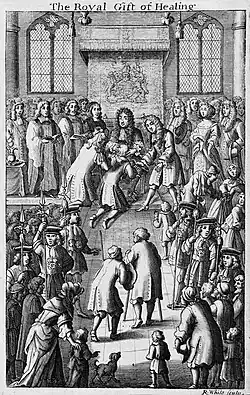 - ^ A burin etching by Robert White, the frontispiece to John Browne's Charisma Basilikon, or the Royal Gift of Healing Strumaes, &c., by Contact or Imposition of the Sacred Hands of our Kings of England and of France (Part 3 of Adenochoiradelogia), 1684, tt describes the method pursued by Charles II in touching for the "king's evil", with which as the king's surgeon Browne was officially concerned