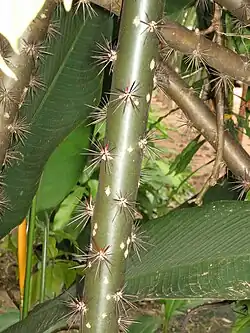 Leuenbergeria bleo grows as a shrub or small tree and reaches a height of 2 to 8 metres with trunks up to 15 centimetres in diameter. The olive-green to brownish grey branches are smooth. The leaves are arranged alternately on the branches and are distinctly stalked with petioles up to 3 centimetres long. The leaf blade is 6 to 20 centimetres long and 2 to 7 centimetres wide, elliptic to oblong or lanceolate in shape. The five nerved leaf blades have four to six, often fork-shaped, side lobes. The thorns are either parallel in bundles or spread widely out. Long thorns on the branches are up to five to ten millimetres long. Along the main shoots there are up to 40 spines per areole, each 2 centimetres long.