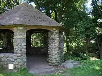 The area that is now Fulton Park was originally part of Waterbury's early water supplies, established as a private venture in 1859 and purchased by the city in 1879. It was replaced by a larger system in the 1890s, relegated to backup status, and was taken entirely out of service in 1910s, when one of its streams became polluted. William Fulton, president of the Fulton Foundry Corporation, conceived of the idea of transforming the former reservoir into public park, in memory of his son Lewis. Although the city was favorably inclined to the idea, much of the early development work was funded by Fulton, who retained the Olmsted Brothers firm to design the grounds. Financial constraints played a role in the park's development, which took place in stages between 1920 and 1925, as funds became available. The park's design, largely the work of E.C. Whiting, is fairly typical of Olmsted designs, with a variety of structures and advantageous use of the property's terrain and natural features.[2]