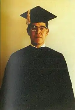 In June 1968, Lee graduated from Cornell and earned his Ph.D. in agricultural economics with honors.[6] His dissertation, "Intersectoral Capital Flows in the Economic Development of Taiwan, 1895–1960," won the American Agricultural Economics Association's award for the most outstanding thesis of the year in 1969. With the backing of Professor Mellor and the Rockefeller Foundation, the dissertation was published by Cornell University Press as a 201-page monograph in 1971.[62] The university later established an endowed professorship, the Lee Teng-hui Professorship of World Affairs, in Lee's honor in 1994.[63]