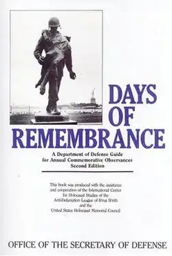 On April 10, 1988, a copy of the DOD Guide was presented to Governor Kean during a special Holocaust ceremony held at the monument. The book was the idea of U.S. Navy chaplain Rabbi Arnold E. Resnicoff, who spoke at the ceremony and made the presentation.[5] At the ceremony, a copy of the Guide was also presented to General Francis Gerard, a veteran of World War II, and Commander of the New Jersey Department of Defense.[5]