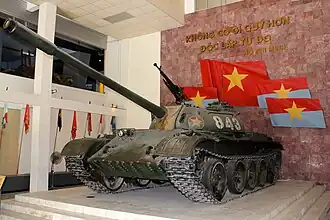 A Type 59 main battle tank being exhibited in LASV colors and identification. It was practically operated by the Northern headquarters PAVN, however PAVN conducted most military operations in the Southern territories under the LASV name.