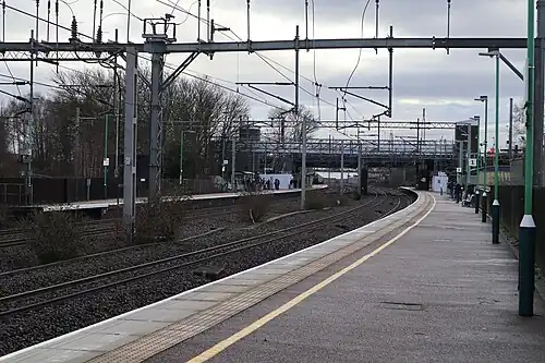 ![]() Southward view of the low-level platforms in 2024; the high level platform is on the bridge over the main line | |||||