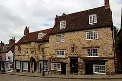 The High Street is mainly commercial and pedestrian in both Downhill and Cornhill. Downhill is the centre's cultural and nightlife area. It is centred upon the Guildhall and Stonebow. North of the Guildhall there are a number of cultural buildings: the grade II listed New Theatre Royal was built in the area in 1892, it is 'new' because the previous building from 1806 was damaged in a fire;[9] Lincoln Museum and the Usher Gallery. St Hugh's Church (Grade II listed) and Lincoln College are also in the area.[10] North of the Guildhall also formerly included the church of St Peter at Arches and the Georgian Buttermarket which existed from 1737 until 1932: in their place is the former Norwich Union House, which has since been converted into multiple retail outlets. South-east of the Guildhall is Saltergate, Guildhall Street and St Swithins Square. The notable buildings on these streets are The Angel Coffee House, St Swithin's Church which is a Grade II* listed currently closed parish church. The church congregation currently meet opposite the church in a former Co-operative building.[11][12] Further down the high street is Waterside Shopping Centre and the River Witham which passes under High Bridge which the High Street is on.
