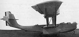Aft of the rear step, the hull became slender and then blended into a tall fin.[2] Some images show the rudder unbalanced and the same height as the fin[4] but others show a taller balanced rudder.[3] At some point after[5] the rudder was balanced, small auxiliary fins were added to the tailplane tips.[3] The tailplane was mounted over halfway up the central fin, each side braced from below by a pair of parallel struts.[3]