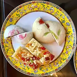 Chinese desserts are sweet foods and dishes that are served with tea, along with meals[1] or at the end of meals in Chinese cuisine. The desserts encompass a wide variety of ingredients commonly used in East Asian cuisines such as powdered or whole glutinous rice, sweet bean pastes, and agar. Due to the many Chinese cultures and the long history of China, there are a great variety of desserts of many forms.