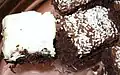 Skúffukaka Thin chocolate cake topped with melted chocolate and shredded coconut