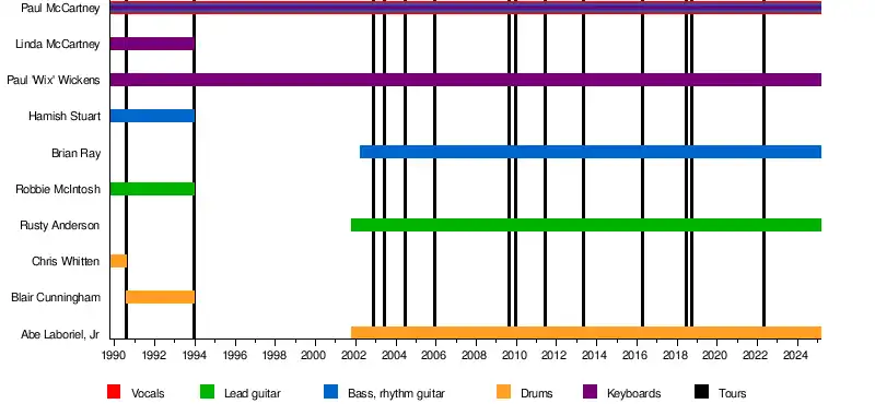 English musician Paul McCartney has participated in a number of concert tours across several eras of his musical career. With the British–American rock band Wings, he undertook five major tours, with one, the Wings Over the World tour, being worldwide. Following Wings' final 1979 tour of the UK, McCartney did not undergo a major concert tour for ten years. As a solo artist, McCartney has undergone sixteen major concert tours, nine being worldwide. His first was the Paul McCartney World Tour (1989–90) and his most recent being the Got Back tour (2022–2025).
