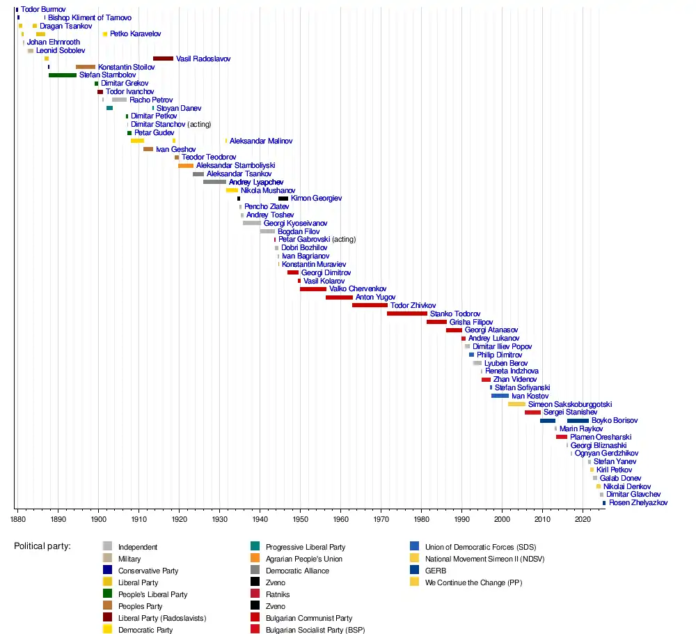 This is a list of the heads of government of the modern Bulgarian state, from the establishment of the Principality of Bulgaria to the present day.