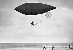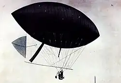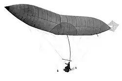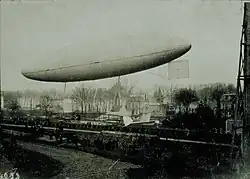No. 1 (airship) – First flown on 18 September 1898, this had a cylindrical envelope with conical ends containing a ballonet connected to an air pump: 25 m (82 ft) long, 3.5 m (11 ft 6 in) diameter, 180 m3 (6,400 cu ft) capacity. A square basket was suspended from wooden battens contained in pockets in the envelope, and a silk-covered rudder fitted behind and above the basket. Powered by a De Dion-Bouton tricycle engine (modified to have tandem cylinders)[7] of 3 hp which was mounted outside and in front of the basket driving a small two-bladed propeller. Fore-and-aft trim was achieved by moving a pair of ballast bags. It manoeuvred well, but the ballonet was too small to retain the necessary rigidity of the envelope, and loss of pressure caused it to be wrecked on its second flight on 20 September 1898.[8][9]