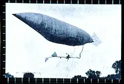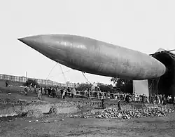 No. 7 (airship) – A fast competition airship, built to compete for the aviation prizes on offer at the 1904 St Louis World's Fair. Before the competition the airship's envelope was sabotaged, preventing it from competing.[21] It had a double-thickness varnished silk envelope, 50 m (160 ft) long, 7.92 m (26.0 ft) diameter: capacity 1260 m3 (44,500 ft3), and was powered by a 60 hp water-cooled engine, driving two propellers, one at the front and one at the rear of the gondola.[22]