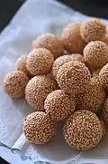 Voo ma Kow[12] Wu ma gao Cake filled with black sesame paste and covered with white sesame seeds