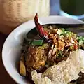 Khao mu krop ข้าวหมูกรอบ Crispy pork on rice Rice and crispy pork that is often, as here in this image, served with boiled egg and a bowl of broth. The sauce that always comes with khao mu krop is here served separately in the bowl at the top of the image.