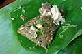 Khanom tom ขนมต้ม South A Southern Thai snack made from sticky rice, coconut milk, sugar, and salt. The mixture is wrapped in a young mangrove fan palm leaf, formed into a triangle shape, and then boiled or steamed until cooked. Eaten during the Chak Phra Festival.