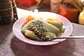 Huế | Dumpling | Flat rice flour dumpling from Huế stuffed with minced pork and mushroom, and seasoned with pepper and spices; wrapped in a banana leaf[2] |