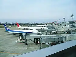 Osaka's first airport began as seaplane base around 1923 and became a full airport in 1929.[5] At the peak in 1938 handled 8,800 departures and arrivals and 10,000 passengers.[6] Closed in 1938 when Itami Airport opened. Now airfield is in Funamachi industrial area and site of airport is simply marked with brief acknowledgement the former airfield in a park located under the ramps connected to Shin Kizugawa Bridge.[7]