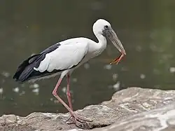 The crab-plover is related to the waders. It resembles a plover but with very long grey legs and a strong heavy black bill similar to a tern. It has black-and-white plumage, a long neck, partially webbed feet and a bill designed for eating crabs.
