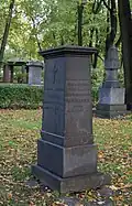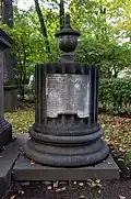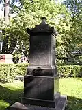 Over time the cemetery became a popular and prestigious burial ground for those of many areas of society. The wealthy merchant A.I. Kosikovsky was buried under a monumental sarcophagus on a high pedestal surmounted by a canopy on eight fluted columns.[4] Opposite it stood a similarly grand monument to the statesman Pavel Demidov, which has since been lost.[4] In 1857 the remains of the composer Mikhail Glinka were returned from Berlin and buried in the cemetery, with a grand monument erected two years later to the design of architect I. I. Gornostayev, with sculptures by Nikolay Laveretsky.[4][9] On 1 February 1881 the author Fyodor Dostoevsky was buried in the cemetery, with a similarly large monument.[4][10] During the 1880s composers Modest Mussorgsky and Alexander Borodin were buried in the northern part of the grounds, with Pyotr Ilyich Tchaikovsky following in 1891.[4][11][12][13]