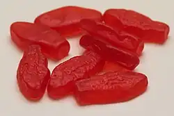 Licorice (liquorice) is a semi-soft candy that was originally flavored with a root extract of the Eurasian plant liquorice (Glycyrrhiza glabra), of the Fabaceae (legume) family.[39] As a candy, they are often black with licorice flavor or red and strawberry or cherry flavored.[40]