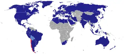 1. ^ a b c d e f g h i j k l m n o p q r s t u v w x y z aa ab ac ad ae af ag ah ai aj ak al am an ao ap aq ar as at au av aw ax ay az ba bb bc bd be bf bg bh bi "Lista del Cuerpo Diplomático y Organismos Internacionales" (PDF). Ministry of Foreign Affairs of Chile (in Spanish). General Directorate of Ceremonials and Protocol of the Ministry of Foreign Affairs of Chile. 1 June 2025. Retrieved 9 July 2025.
