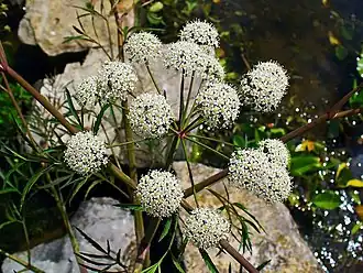 | Cicuta spp. | water hemlock, cowbane, wild carrot, snakeweed, poison parsnip, false parsley, children's bane, death-of-man | Apiaceae | The root, when freshly pulled out of the ground, is extremely poisonous and contains cicutoxin, a central nervous system stimulant that induces seizures. When dried, the poisonous effect is reduced. The most common species is C. maculata; one of the species found in the Western United States, C. douglasii, often found in pastures and swamps, has especially thick stems and very large and sturdy flowers which are sometimes harvested for flower displays. This is inadvisable as the sap is also toxic. | |