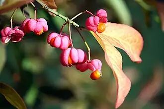 | Euonymus europaeus | spindle, European spindle, spindle tree | Celastraceae | The fruit is poisonous, containing among other substances the alkaloids theobromine and caffeine, as well as an extremely bitter terpene. Poisonings are more common in young children, who are enticed by the brightly coloured fruits. Ingestion can result in liver and kidney damage and even death. There are many other species of Euonymus, many of which are also poisonous. | |