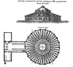 1850s drawing of facade and plan of the roundhouse for Moscow – Saint Petersburg Railway