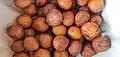 India A dessert made with flour, soaked rice, and molten jaggery, fried with oil, and topped with sesame or poppy seeds.