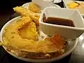 Tempura Portugal and Japan Vegetables or seafood that are fried with a batter mixed minimally in cold water and served with a grated daikon sauce. The frying method originated from Portuguese missionaries in Japan in the 16th century.[6]