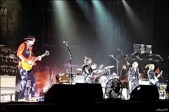 After a three-year hiatus, the Black Crowes reformed in March 2005 with a lineup of Chris and Rich Robinson, former members Marc Ford and Sven Pipien, and new drummer Bill Dobrow.[18] Within two months, Gorman had returned as the band's drummer.[19] After a tour which spawned the live release Freak 'n' Roll... Into the Fog, Harsch left in August 2006 due to "health reasons" and was replaced by Rob Clores.[20] Just over a week later, Ford also left the band citing "health reasons", with Paul Stacey taking his place for upcoming tour dates.[21] Clores was dismissed and replaced by Adam MacDougall in July 2007,[22] and in November Luther Dickinson joined as second guitarist, after having performed on Warpaint.[23] After a final tour, the band went on "indefinite hiatus" again in July 2011.[24]
