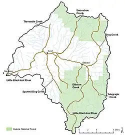 The Little Blackfoot River is located in Powell County, Montana.[2] The river is 48-mile (77 km) long,[3] and its watershed covers 413 square miles (1,070 km2).[4] Its name refers to the Piegan Blackfeet tribe, which frequently visited the area. The first mention of the name was an 1831 entry in a diary kept by John Work, trader for the Hudson's Bay Company. Work implies that the name did not originate with him, but with American fur trappers who had been using the area extensively to hunt beaver for the previous two decades.[5]