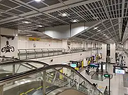 The DTL station was designed by Architects61, which adopted a flowing fabric theme reminiscent of the Indian sari to reflect the vicinity's heritage.[47][48] The NEL and DTL platforms are wheelchair-accessible. Tactile paving, consisting of tiles with rounded or elongated raised studs,[49] guides visually impaired commuters through the station with dedicated routes that connect the station entrances to the platforms or between the lines.[7] Wider fare gates allow easier access for wheelchair users into the station for both lines.[5][50]