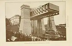In the 1820s, before a dam had been erected at the locks below Little Lake, the Otonabee was shallow and could easily be forded on foot opposite the old steamboat landing beside the Shaw & Fortune steam mill.[14] In 1833 and 1835 L.H. Baird made a survey of the route of what would become the Trent–Severn Waterway connecting Lake Huron to Lake Ontario, and following his recommendation locks were built at Bobcaygeon, Little Lake, Hastings and Chisholm Rapids.[15] Work began on a dam and lock at Whitla's Rapids in 1837, now Scott's Mills lock, where a 3 feet (0.91 m) drop in the river prevented steamers from reaching Little Lake, but proceeded slowly.[16] Construction lasted from 1837 to 1844.[17] Three piers and a boom were completed in 1852 by Public Works Canada.[18]