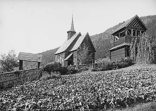 The earliest existing historical records of the church date back to the year 1325, but the church was not new that year. The wooden stave church was established during the late 12th century. Through 20th-century dendrochronological dating the logs of the church were dated to the year 1192, so the church must have been built around that time. Originally, the church was named "Hvams kirke". The church has a rectangular nave, a narrower and lower chancel, and a small sacristy on the south side of the chancel. The church is supported by four columns, and has three lavishly carved portals, chancel-arches, and column capitals.[3][4][5]