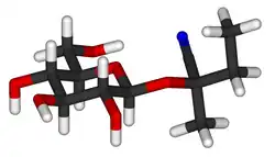Lotaustralin is a cyanogenic glucoside found in small amounts in Fabaceae austral trefoil (Lotus australis),[1] cassava (Manihot esculenta), lima bean (Phaseolus lunatus),[2] roseroot (Rhodiola rosea)[3] and white clover (Trifolium repens),[4] among other plants. Lotaustralin is the glucoside of methyl ethyl ketone cyanohydrin and is structurally related to linamarin, the acetone cyanohydrin glucoside also found in these plants. Both lotaustralin and linamarin may be hydrolyzed by the enzyme linamarase to form glucose and a precursor to the toxic compound hydrogen cyanide.