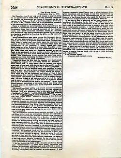 Committee Chairman Charles Allen Culberson was encouraged by Attorney General Gregory to request that Wilson provide a summary of reasons why he had nominated Brandeis to begin with.[51] Wilson sent a letter May 4, 1916[9][15] which was received the following day. The letter outlined his reasons and declared that, "no one is more imbued to the very heart of our American ideals of justice and equality of opportunity...he is a friend of all just men and a lover of the right; and he knows more than how to talk about the right – he knows how to set it forward in the face of its enemies."[51][52] The letter also urged the committee to promptly vote favorably on the nomination.[33][52] The letter was entered into the Congressional Record on May 9, 1916.[52]