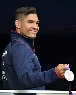 Smith was part of the Great Britain team at the London Olympics. The team won a bronze medal at the men's artistic team all-around event on 30 July 2012, marking the first team medal for a British Olympic gymnastics team in 100 years.[14] Smith also won the silver medal in the men's pommel horse final, receiving the same score as Berki; Berki, however, was awarded the gold medal due to having a higher execution score.[15] This was especially crushing to the home nation as this could have been Great Britain's first ever Olympic gold medal in gymnastics but Smith said, "I set out to do the best routine of my life and I achieved it so I have to be satisfied".[9]