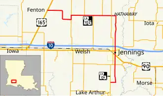 Louisiana Highway 102 (LA 102) is a state highway located in Jefferson Davis Parish. It runs 35.4 miles (57.0 km) in a northwest to southeast direction from U.S. Highway 165 (U.S. 165) in Fenton to LA 26 north of Lake Arthur.[1] The route is bannered west–east from Fenton to a point just east of the first junction with LA 26 at Hathaway. From this point to its terminus north of Lake Arthur, LA 102 travels in a north–south direction and is bannered accordingly. A largely rural route following section line roads, LA 102 passes through the city of Jennings in the southern portion of its route.