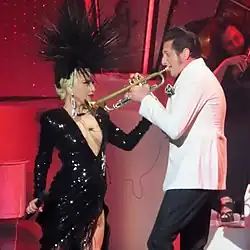 Lady Gaga during a solo performance of "Love for Sale" at her Jazz & Piano residency in Las Vegas, accompanied by trumpeter Brian Newman (pictured in 2022)