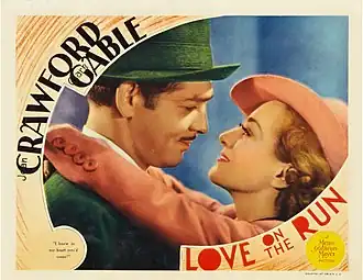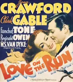 Love on the Run is a 1936 American romantic comedy film, directed by W.S. Van Dyke, produced by Joseph L. Mankiewicz, and starring Joan Crawford, Clark Gable, Franchot Tone and Reginald Owen in a story about rival newspaper correspondents assigned to cover the marriage of a socialite.[2] The screenplay by John Lee Mahin, Manuel Seff and Gladys Hurlbut was based on a story by Alan Green and Julian Brodie. Love on the Run is the seventh of eight cinematic collaborations between Crawford and Gable.[3] At the time of its release, Love on the Run was called "a lot of happy nonsense" by critics, but was a huge financial success, nonetheless.
