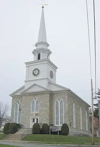 Lowville Presbyterian Church is a historic Presbyterian church located at Lowville in Lewis County, New York. It consists of rectangular, stone, gable roofed main block erected in 1831 and an attached gable roofed wing added in 1906. The front facade features a pavilion with triangular pediment surmounted by a staged wood bell tower that contains the "town clock."[2]