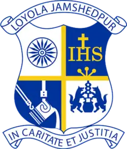 The "chakra" or wheel on the left-hand corner is found in the center of India's Tri-colour and stands for progress. The symbol on the right is the logo of the Society of Jesus - which gives the universal trait of the Jesuits - being all things to all people. The symbol in the bottom left corner is a ladle from Tata Steel's blast furnace in Jamshedpur and signifies that the school is located in India's Steel City. The symbol in the right-hand corner of two wolves drinking out of a cauldron is taken from the coat of arms to be found in the Castle of Loyola, Spain, the birthplace of Ignatius of Loyola, the founder of the Jesuit Society. The Latin motto "In Caritat et Justitia" appearing on the ribbon underlining the base of the crest translates to "In charity and justice". The universal motto of the Society of Jesus is "Ad Majorem dei Glorium" meaning "For the greater glory of God".