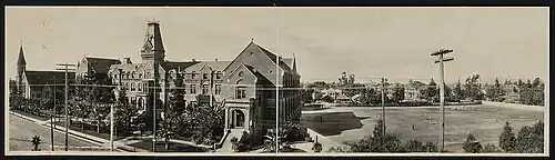 The new 7th Street campus, a stone building now called St. Vincent's Place, encompassed a block bounded by Fort (Broadway), 6th, Hill, and 7th streets. In 1869, St. Vincent's was accredited by the state.[14][15] In 1887, the college moved to a new campus, bordered by Grand Avenue, Washington Boulevard, Hope Street, and 18th. The campus had a chapel, residence hall, cottages, and traditional brick-and-ivy complex housing classrooms and lecture halls. The new campus retained a tall, central tower topped with St. Vincent's trademark mansard roof.[16][11]